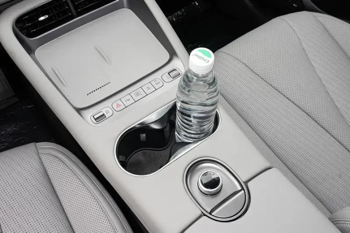 储物空间方面,前排中控台底部配置了两个开放式的手机槽,左侧还带有无线充电和通风降温功能。后方的杯架带有限位器,大小适中。前排的中央扶手下面是冰箱,冷热皆宜,方便出行储存饮品。